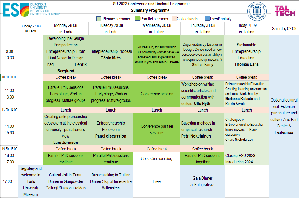 Tartu University and Tallinn University of Technology are happy to invite you to the ESU 2023 Conference and Doctoral Programme from 27 August to 02 September 2023. The first two days are held at the University of Tartu. Buses will take everyone to Tallinn on Tuesday evening, 29.08 to continue the conference in Tallinn. The ESU conference will include the traditional Gala Dinner on 31 August.