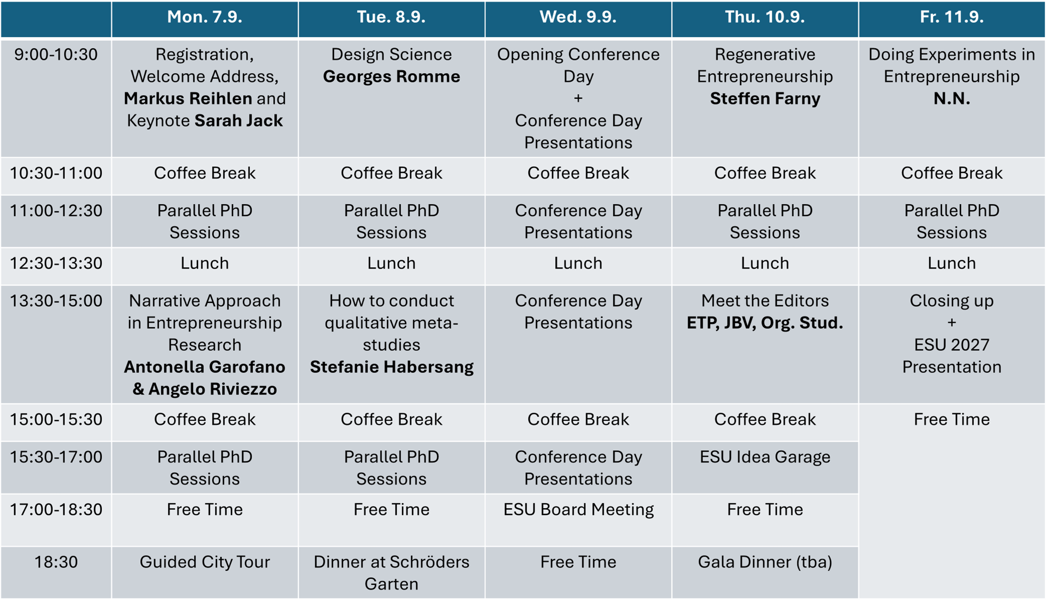 - Plenary sessions on specific topics with keynote speakers who will inspire and invite critical reflection on a variety of issues related to entrepreneurship. The topics typically include entrepreneurship, innovative methodologies, the publication and review process, and career paths in academia and beyond your PhD in entrepreneurship.